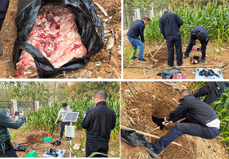 在武漢世隆科技有限公司技術人員的協助下,武漢市公安局刑警進行了利用探地雷達探測地下骨頭的現場測試?,F場開挖掩埋已準備好的豬大骨,然后利用SL-GPR無線探地雷達進行探測實驗。
