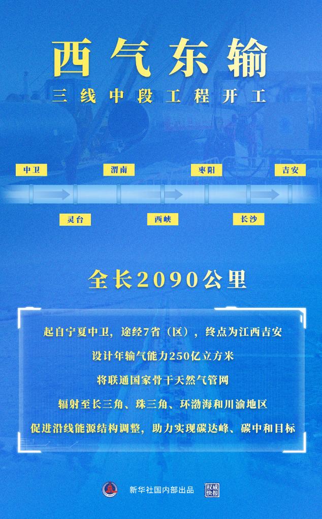 新華社北京9月23日電(記者戴小河)23日,西氣東輸三線中段(中衛—吉安)工程在寧夏中衛正式開工建設,工程全長2090公里,起自寧夏中衛,途經寧夏、甘肅、陜西、河南、湖北、湖南、江西7省(區),終點為江西吉安。