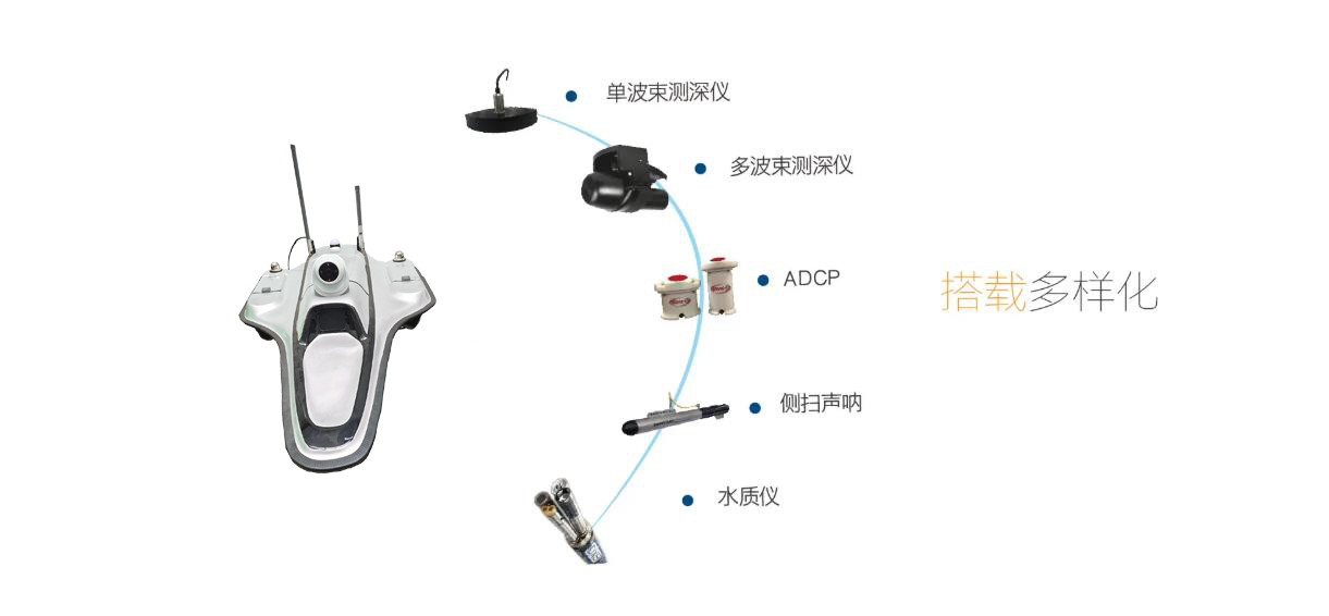 可根據需要靈活搭載GNSS接收機、測深儀(單波束/多波束)、側掃聲吶、ADCP、多參數水質監測儀、監控警報等多種傳感器設備,可執行大范圍水域的水文測量、水下地形/地貌測量、流速流量監測、無人巡邏及水質在線監測等多種功能。